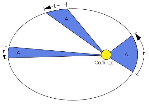 Каждая планета движется в плоскости, проходящей через центр Солнца, причём за равные промежутки времени радиус-вектор, соединяющий Солнце и планету, описывает равные площади.